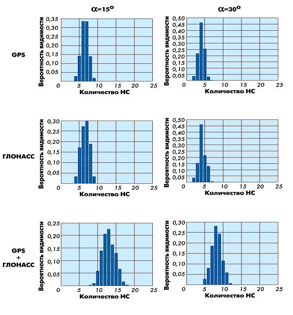 Основная функция навигационного КА – формирование и излучение бортовым навигационным передатчиком (БНП) радиосигналов, необходимых для навигационных определений потребителей ( Навигационные сигналы КА содержат дальномерные компоненты и компоненты служебных сообщений. Первые используют для определения в аппаратуре потребителей ССН навигационных параметров (дальности, ее производных, пространственно-временные координаты (ПВК) и т.д.), вторые – для передачи потребителям координат спутников, векторов их скоростей, времени и др. Основная часть служебных сообщений спутника подготовлена в подсистеме контроля и управления (НКУ) и передана по радиолинии на борт КА. И только небольшая их часть формируется непосредственно бортовой аппаратурой КА. Дальномерные компоненты навигационных сигналов содержат две составляющие, отличающиеся обеспечиваемой ими точностью навигационных определений (стандартной и более высокой). В аппаратуре гражданских потребителей обрабатывается сигнал стандартной точности. Для использования сигнала высокой точности требуется санкция соответствующих органов. Выбор состава и конфигурации орбитальной группировки НС (ПНС) может обеспечить заданную рабочую зону, возможность реализации различных методов навигационно-временных определений (НВО), непрерывность и точность НВО, диапазон изменения параметров радиосигналов КА и т.д. Например, увеличение высоты полета КА современных средневысотных ССН до примерно 20 000 км позволяет принимать сигналы каждого КА на значительных территориях (приблизительно на половине поверхности Земли). И тогда несколько КА, расположенных на определенных орбитах, могут формировать сплошное, с точки зрения наземного и авиационного потребителя, радионавигационное поле (глобальную рабочую зону). Гистограммы видимости навигационных КА систем GPS, ГЛОНАСС и их комбинаций приведены на рис.3.