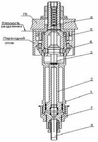 Детонационный замок. В данной конструкции используется детонационный замок тянущего типа (см. рис.5). Замок состоит из корпуса поз. 1, в котором в кольцевую канавку запрессовано эластичное взрывчатое вещество (ЭВВ) поз. 4, штока с разрывным элементом поз. 2, амортизатора поз. 3, упирающегося в гайку поз. 5. Стык затягивается гайкой поз. 6, между двумя стыковочными шпангоутами расположена специальная рифленая шайба поз. 8. С двух сторон к корпусу подводятся трансляторы детонации поз. 7.