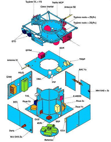Пример 6. УКП Mk-1 и Mk-3 французской космической системы изучения природных ресурсов Земли SPOT. Состав унифицированной платформы Mk-1, модульный принцип построения (два основных модуля: двигательный и бортовых обслуживающих систем) и основные структурные элементы УКП Mk-3 приведены на рис. 22 -24. Летный экземпляр платформы Mk-3 на тепловакуумных испытаниях приведен на рис.25. Основные технические характеристики УКП Mk-1 приведены в табл.4.