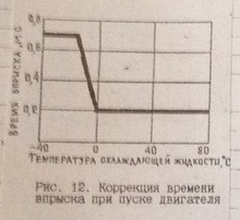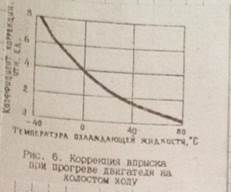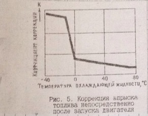 Коррекция для увеличения приемистости двигателя во время прогрева. Увеличение приемистости двигателя во время прогрева обеспечивается зависимостью коэффициента коррекции от температуры охлаждающей жидкости, показанной на рис. 7.