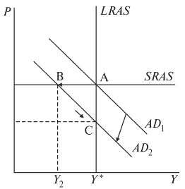 15.Шоки совокупного спроса и совокупного предложения. Шок – это неожиданное резкое изменение либо совокупного спроса, либо совокупного предложения. Различают позитивные шоки (неожиданное резкое увеличение) и негативные шоки (неожиданное резкое сокращение) AD и AS. Позитивные шоки совокупного спроса сдвигают кривую AD вправо. Позитивные шоки совокупного предложения сдвигают кривую AS: вниз, если она имеет горизонтальный вид (SRAS); вправо вниз, если она имеет положительный наклон (SRAS); вправо, если она вертикальна (LRAS). Негативные шоки совокупного спроса сдвигают кривую AD влево, а негативные шоки совокупного предложения сдвигают кривую AS в зависимости от ее вида вверх (SRAS), влево вверх (SRAS) или влево (LRAS). Причинами позитивных шоков совокупного спроса могут быть либо резкое непредвиденное увеличение предложения денег, либо неожиданное резкое увеличение любого из компонентов совокупных расходов (потребительских, инвестиционных, государственных или иностранного сектора). Механизм и последствия воздействия позитивного шока совокупного спроса на экономику фактически рассмотрены выше (рис. 3.10), и в краткосрочном периоде проявляются в виде инфляционного разрыва выпуска, когда фактический ВВП превышает потенциальный (Y 2 > Y *), что в итоге ведет к росту уровня цен (инфляции). Противоположными являются последствия негативного шока (резкого сокращения) совокупного спроса (рис. 3.11), причинами которого могут быть либо неожиданное сокращение предложения денег (сжатие денежной массы), либо резкое сокращение совокупных расходов. В краткосрочном периоде это ведет к уменьшению объема выпуска и означает переход экономики из точки А в точку В – точку краткосрочного равновесия (снижение совокупного спроса, т. е. совокупных расходов, обусловливает увеличение запасов фирм, затоваривание, невозможность продать произведенную продукцию, что служит причиной свертывания производства). Появляется рецессионный разрыв выпуска – ситуация, когда фактический ВВП меньше потенциального (Y 2 < Y *). В условиях совершенной конкуренции предприниматели начнут снижать цены на свою продукцию, уровень цен снизится (от Р 1 до Р 2), т. е. произойдет дефляция (в экономической литературе поэтому можно встретить понятие дефляционного разрыва), величина совокупного спроса увеличится (движение вдоль кривой AD), и экономика попадет в точку С – точку долгосрочного равновесия, где объем производства равен потенциальному. Подобная ситуация может иметь место лишь в условиях совершенной конкуренции. При несовершенной конкуренции действует так называемый «эффект храповика» (храповик в технике – это механизм, позволяющий устройству двигаться только вперед).