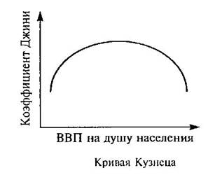 18.Последствия экономического роста. Последствия экономического роста заключаются в повышении жизненного уровня населения. Экономический рост желателен, он дает возможность обществу потреблять больше реального материального продукта и услуг, а также увеличивает объем предоставляемых общественных благ, повышая, таким образом, реальный уровень жизни. Повышение уровня жизни посредством экономического роста находит выражение: • в увеличении свободного времени. Досуг — одно из жизненных благ. Сегодня этот фактор признается едва ли не основной ценностью собственно человеческого существования и служит мерилом общественного прогресса. При достижении определенных стандартов благосостояния все больше работающих предпочитает совмещать работу с более длительным отдыхом. В 1960-е гг. в развитых странах началась революция свободного времени, выразившаяся в резком увеличении его объема в большинстве развитых стран. За последние 100—130 лет страны Запада добились впечатляющих результатов: средний годовой фонд отработанного времени на одного работника за весь период его трудовой жизни Снизился в Великобритании на 50 %, в США, Германии и Франции — на 46—47 %, в Японии — на 36 %; • росте среднедушевых доходов и снижении дифференциации по доходам. Экономический рост выражается в росте национального дохода на душу населения. Более справедливое распределение доходов в обществе становится весомым психологическим стимулом, обуславливающим участие широких слоев населения в экономической жизни общества. В экономической литературе не так много работ о взаимосвязи экономического роста и распределении доходов. Саймон Кузнец, впервые исследовавший модель роста современных развитых стран, предположил, что на ранних стадиях роста распределение дохода имеет тенденцию к ухудшению, а на более поздних — к улучшению. Графически эта зависимость представлена на рисунке.