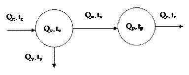 5.1. Теоретичні відомості Вирощування рослин в закритому ґрунті вимагає використання систем підігріву повітря і ґрунту для створення комфортних умов вирощування рослин. Обігрівання приміщення теплиць виконується парою, пароводяною сумішшю або гарячою водою. Як показала практика збільшення температури води на 30 – 35 оС приводить до зменшення кількість опалювальних труб-радіаторів, які встановлюються в теплиці, у два рази. Обігрівальні труби прокладаються в ґрунтових теплицях у ґрунті, в стелажних теплицях під стелажами, а також вздовж стін і під скляним дахом. При створенні математичної моделі опалення теплиці будемо вважати, що вона є об’єктом із зосередженими параметрами. Температура повітря в теплиці tр однакова для всього об’єму теплиці, а температура води у опалювальних трубах tv має середньоарифметичне значення між вхідною температурою гарячої води tg і температурою води на виході з теплиці tу. Складемо статичну модель технологічного об’єкту по каналу температури. Для цього представимо об’єкт у вигляді двох ланок, які акумулюють енергію – це ланка води, що гріє, і ланка повітря теплиці, яке ми підігріваємо, див. рис. 5.1.