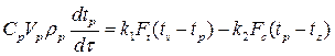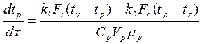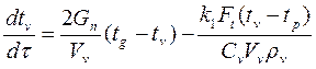 де avt, atp, apc, acz – коефіцієнти тепловіддачі відповідно від води до стінки труби, від стінки труби до повітря теплиці, від повітря теплиці до скла стінки теплиці, від скла до зовнішнього повітря; lt, lc – коефіцієнти теплопровідності відповідно сталі труби і скла стінки; dt, dc – товщина стінки труби і скла. Від статичної моделі перейдемо до динамічної. Враховуючи рівняння статики і вище приведені рівняння отримаємо систему диференційних рівнянь зміни кількості тепла в часі у воді і повітрі теплиці. З урахуванням параметрів, які ми вважаємо незмінними, як то: об’єми середовищ, густину, і теплоємність повітря і води похідні будуть знаходитись по температурі (середній) води tv і температурі повітря tр теплиці: