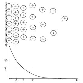 Рис. 4.1. Схема строения двойного электрического слоя и изменение потенциала.