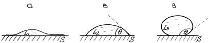 Рис. 6.2. Контактные углы, образованные жидкостями на поверхности твердого тела: S - твердое тело; L - капля жидкости;