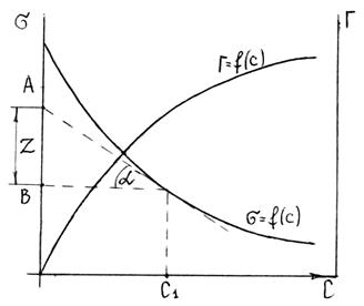 Рис. 6.5. Построение изотермы адсорбции по изотерме поверхностного натяжения.