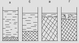 Рис. 8.1. Стадии ограниченного набухания: а – система полимер-растворитель до набухания; б – первая стадия набухания; в – вторая стадия набухания; г – вторая стадия набухания с частичным растворением полимера.
