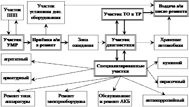 автомобиля. При рассмотрении зон ТО (ЕО, ТО-1, ТО-2) необходимо учитывать суточную программу по ТО данного вида, число и тип подвижного состава, перечень регламентных работ по ТО, трудоёмкость обслуживания и режим работы автомобилей на линии. Работы по ТР выполняются по потребности, которая выявляется в процессе работы на линии, при контроле автомобилей на КТП, в процессе диагностирования и ТО. Наиболее распространённым методом текущего ремонта является агрегатно-узловой метод. Подвижной состав ремонтируют на универсальных или специализированных тупиковых или проездных постах, которые располагаются в производственном корпусе параллельно или последовательно. На постах зон ТР выполняются в основном контрольные, разборочно-сборочные, регулировочные и крепёжные работы, которые составляют 40-50% от общего объёма работ по ТР. Остальной объём ремонтных работ выполняется на специализированных участках, число которых в зависимости от размера АТП принимается от четырёх до восьми. При агрегатном методе ремонта производят замену неисправного агрегата (узла) исправным (новым) или заранее отремонтированным из оборотного фонда. Неисправные агрегаты (узлы) после их ремонта поступают в оборотный склад. Это позволяет сократить время простоя автомобилей в ремонте, поскольку сроки ремонта сокращаются за счёт отсутствия трудозатрат на ремонт снятого с автомобиля агрегата (узла). При индивидуальном методе ремонта агрегаты не обезличиваются. Снятые с автомобиля агрегаты (узлы) после ремонта ставят на тот же автомобиль, что увеличивает время простоя автомобиля в ремонте, поэтому данный метод применяют только при отсутствии оборотного фонда агрегатов. В основу технологического маршрута ТО и ремонта автомобилей на СТОА положена следующая функциональная схема (рис.2). После выполнения УМР, автомобили поступают на пост приёмки для определения их технического состояния, требуемого объёма работ, сроков и стоимости ремонта, а также оформления соответствующих документов (заявка на ремонт, акт приёма-передачи, заказ-наряд). Если при приёмке невозможно определить причину возникновения той или иной неисправности автомобиль направляется на пост диагностики, после которого автомобиль попадает на соответствующий производственный участок СТОА. В случае занятости рабочих постов, автомобиль поступает на места ожидания, откуда по мере освобождения постов устанавливается на соответствующий участок. После проведения ТО и ремонта автомобиль направляется на участок выдачи, где контролируется качество выполненных работ в соответствии с заказ-нарядом, а затем производится выдача автомобиля клиенту. Итогом данного раздела должна быть оценка существующей схемы организации технологического процесса ТО и ремонта с точки зрения его гибкости и возможности механизации; минимизации вре-