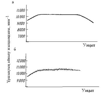 15.1 сурет. Базисті (а) жә не базисті-қ абатты реттеудегі ұ ршық тың айналу жылдамдығ ының ө згерісі Иіру жылдамдығ ын жинауды 12-15%-ғ а атқ арғ ан мерзімде базистік реттеу мен 1: 1, 5 диапазонында бекітіп реттеукө бінесе технологиялық процесс талаптарын қ анағ аттандырады. Бұ л жағ дайда ү зіктігі машинаның реттегішсіз жұ мыс істеуімен салыстырғ анда 8%-ғ а тө мендейді. Сө йтіп, мақ та иіретін машиналардың, ә детте, жетегі реттелмейді немесе иіру жылдамдығ ының базистік реттелуін қ амтамасыз етеді. Қ ымбат бағ алы шикізат ү шін (мысалы, таза жіпті тү тіп иіру) орнату бекіткіш, базистік жә не қ абатты реттеуді қ амтамасыз ететін кү рделі жетектерді қ олданғ ан тиімді. Тағ ы бір маң ызды жә йт, жү н иіретін машиналар ө те тө мен жылдамдық пен жұ мыс істейді жә не сондық тан да бұ л машиналардың қ озғ алтқ ыш қ ұ рылғ ыларының ө тпелі процестерінің серпіні мақ та иіретін машиналарғ а қ арағ анда едә уір жақ сырақ. Базистік-қ абатты реттеудің қ олданылуы жинаудың атқ арылуын ү зіктілікті азайтудың арқ асында қ ысқ артуғ а жә не шығ ындарды едә уір азайтуғ а мү мкіндік береді. Бұ л жү ннен бұ йым жасап шығ аратын ө ндіріс ү шін ө те маң ызды. Базистік-қ абаттық реттеу кезіндереттеу терең дігі 12-14% болғ ан жағ дайда ү зіктілік аз байқ алады. Бұ л жағ дайда машиналардың ө німділігі 3-9%-ғ а артып, қ алдық тардың мө лшері – 2-11% азаяды. Жоғ арыда айтылғ андарды ескерсек, ұ ршық тар жетегінің негізгі электр қ озғ алтқ ышы олардың айналу жиілігінің 2, 5-1 диапазонында бір сарынды ө згеруін қ амтамасыз ету керек. Мұ ндай электр қ озғ алтқ ыштар ретінде негізінен тұ рақ ты ток электр қ озғ алтқ ыштарын немесе коллекторлық ү ш фазалық ток электр қ озғ алтқ ыштарын қ олданады (15.2 сурет). Жіптің созылудын реттеудің қ арапайым тү рінде механикалық вариаторлы асинхронды жә не қ ысқ а тұ йық талғ ан қ озғ алтқ ыштар қ олданылады. Початкаларды бұ руғ а арналғ ан сақ иналы жұ қ а тақ тайшалардың, желдеткіштердің, транспортерлардың кө теру жә не тү сіру жетектері сондай-ақ асинхронды электр қ озғ алтқ ыштардан жү зеге асырылады.