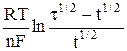 где В уравнении (4) принято, что в начальный момент времени концентрация восстановленной формы в растворе равна нулю. Подставляя уравнения (3) и (4) в уравнение Нернста можно получить уравнение хронопотенциометрической кривой