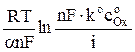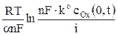 где tOx и tRed – переходное время соответственно для процессов восстановления и окисления; io – плотность тока обмена. Величина перенапряжения равна разности между потенциалами электрода при пропускании тока и равновесным или стационарным потенциалом электрода при токе во внешней цепи равном нулю. Перенапряжение катодного процесса отрицательно. Для начального момента времени, t = 0, и при условии, что в начальный момент времени концентрация восстановленной формы cRed в растворе равна нулю – в этом случае второе слагаемое под знаком логарифма, содержащее