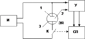 Рис.2. Принципиальная схема установки для снятия хронопотенциограмм. И – регулируемый источник тока – гальваностат; ЭЯ – электрохимическая ячейка (1 – рабочий электрод; 2 – электрод сравнения; 3 – вспомогательный электрод); У – усилитель; СП – самописец или осциллограф; - К – ключ. Сплошными линиями показано направление электрического сигнала между рабочим электродом и электродом сравнения; пунктирная линия указывает, что одновременно с замыканием ключа начинает двигаться лента самописца или луч осциллографа