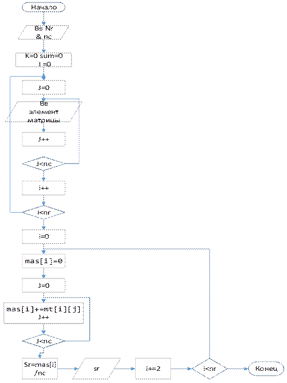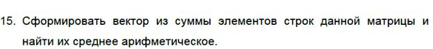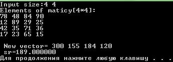 printf(" Elements of maticy[%i*%i]: \n", nr, nc); for (i=0; i< nr; i++) for(j=0; j< nc; j++) scanf_s(" %i", & mt[i][j]); int mas[MAX]; for (i=0; i< nr; i++) { mas[i]=0; for(j=0; j< nc; j++) { mas[i]+=mt[i][j]; } } for(int i=0; i< nc; i++) { sum+=mas[i]; k++; } sr=sum/k;