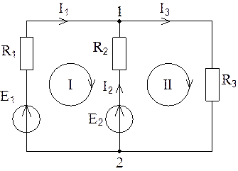 Дано: E1, Е2, R1, R2, R3. Необходимо определить токи в ветвях схемы. Для этого выполним следующие действия. 1. Произвольно выберем и укажем на схеме положительные направления токов в ветвях и положительные направления обхода независимых контуров. Примем за положительное направление обхода этих контуров обход по часовой стрелке. 2. Для (У–1) узлов составим уравнение по первому закону Кирхгофа, например, для узла «1»