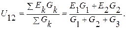 2. Определяется напряжение между узлами 1 и 2 по формуле