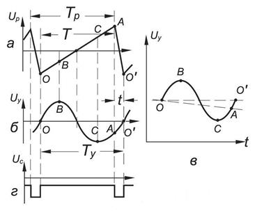 перпендикулярных направлениях. Таким образом, в каждый момент времени луч находится в точке экрана, соответствующей векторной сумме двух напряжений UX и UY. В итоге, как это видно из рис. 36.2, в, световое пятно будет двигаться по прямой линии под углом 450 к осям X и Y. Угол наклона зависит от соотношения амплитуд UX и UY. Если же при равных амплитудах и частотах изменять фазовый сдвиг φ между UX и UY, то на экране сформируется эллипс, вырождающийся в прямую линию при φ = 0, π, а при φ = π /2 - в окружность (рис. 36.2, г, д). При неравных но кратных между собой частотах напряжений UX и UY на экране луч описывает более сложные фигуры – так называемые фигуры Лиссажу. Например, при соотношении частот 1: 2 и различных фазовых соотношения наблюдается ряд фигур, изображенных на рис. 36.2, е. Фигура Лиссажу неподвижна лишь при строго кратных соотношениях частот FX и FY, в противном случае фигура начинает совершать периодическое движение с частотой, равной разности частот / FX - FY/ = Δ F. Например, при Δ F =0, 1 Гц, полный период движения фигуры составляет 10 с, что легко может быть определено визуально и даже измерено секундомером. Таким образом, с помощью фигур Лиссажу, имея в своем распоряжении источник образцовой (эталонной) частоты, можно с высокой степенью точности измерять неизвестные частоты и оценивать их стабильность. Рассмотрим теперь, каким образом на экране осциллографа можно наблюдать саму форму кривой изменения исследуемого напряжения, т.е. получить на экране график зависимости исследуемой периодической функции от времени. При этом очевидно, что ось ординат получается непосредственно, если используемое напряжение UY приложить к вертикально отклоняющим пластинам Y. Для обеспеченияже временного масштаба, т.е. развертки по оси X, необходимо отдельно сформировать такое напряжение, которое бы вызвало движение луча по экрану в горизонтальном направлении с постоянной скоростью. Такое движение может быть обеспечено линейно-растущим напряжением (рис. 36.3, а, участок ОА). При этом луч равномерно движется по экрану от его левого края (исходное напряжение в точке О меньше нулевого уровня, соответствующего положению луча в центре экрана) до правого (напряжение в точке А), после чего должен быть возвращен по возможности быстро в исходное положение, т.е. напряжение должно быть скачком уменьшено до исходного уровня U0 (участок АО ', рис. 36.3, а). Участок ОА называется прямым ходом развертки, а скачкообразное уменьшение – участок АО ' – обратным ходом развертки, так как луч возвращается в исходное состояние. Будем полагать, что начало прямого хода развертки совпадает с нулевой точкой нашего исследуемого синусоидального напряжения (рис. 36.3, б).