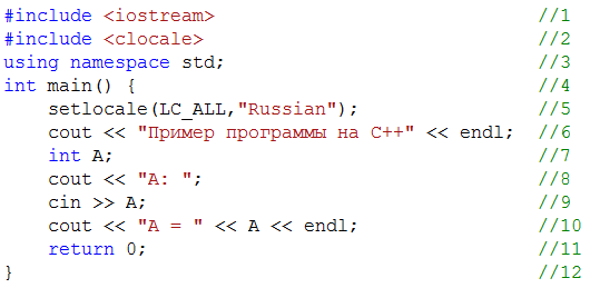 Структура программы на языке С++ Программа на С++ состоит из функций, директив и описаний. Все функции имеют заголовок и тело. В заголовке сначала указывается тип возвращаемого функцией значения, затем – имя функции, за которым в скобках перечисляются параметры функции. Даже если у функции нет параметров, круглые скобки нужно писать. Если функция не возвращает никакого значения, то используется специальный тип void. Тело функции заключается в фигурные скобки { }. Внутри скобок располагаются операторы языка. Каждый оператор завершается символом «;». Точка с запятой после «}» не ставится. Главная функция называется main. С этой функции начинается выполнение программы, поэтому она всегда должна присутствовать в вашем проекте. По стандарту функция main возвращает значение типа int. Само возвращаемое значение указывается внутри функции с помощью оператора return, но для функции main его можно не писать. Комментарии в программе бывают 2 типов: многострочные и однострочные. Для задания однострочных комментариев используются две наклонные черты, для многострочных – конструкция /*...*/: //Пример однострочного комментария (до конца строки) /*Пример комментария, занимающего несколько строк*/ Имена объектов программы могут состоять из латинских букв, цифр и символов подчеркивания. Начинаться имена должны с буквы или символа подчеркивания. Прописные и строчные буквы – это разные символы, следовательно, имена x1 и X1 будут разными. При наборе служебных слов и стандартных имен также нужно учитывать регистр. Пример 1.1. Программа выводит на экран текст «Пример программы на С++», вводит значение переменной A и затем выводит его на экран.