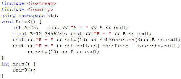 При работе с консольными приложениями существуют два основных способа ввода-вывода данных. Первый способ – это использование функций printf() и scanf(), унаследованных из языка С. Второй – использование объектов cin и cout языка С++. В одной программе не рекомендуют смешивать эти способы. Мы будем использовать второй способ. Примеры использования функций без труда можно найти в литературе по С++. Чтобы объекты cin и cout были доступны, как уже говорилось, нужно подключить к вашей программе заголовочный файл iostream. Объект cout используется для вывода в окно консоли. Ему с помощью операции < < (операции помещения в поток) передается то, что мы хотим вывести на экран. Это могут быть переменные любых стандартных типов, литералы, выражения. Например, символьный литерал – это последовательность любых символов, заключенная в кавычки. Для вывода нескольких элементов используется цепочка операций < <. В зависимости от типа данные из внутреннего представления преобразуются в текстовую строку, которая и выводится на экран. В цепочку можно также помещать специальные функции, которые называются манипуляторами, для форматирования данных. При использовании манипуляторов с параметрами необходимо подключить к программе заголовочный файл iomanip. Некоторые полезные манипуляторы: endl – включает в поток символ новой строки и выгружает буфер, используется для перехода на новую строку; setw(int) – устанавливает максимальную ширину поля вывода для следующего значения; setprecision(int) – устанавливает максимальное количество цифр в дробной части или общее количество значащих цифр для чисел в зависимости от формата; fixed – устанавливает формат числа «с фиксированной точкой»; scientific – устанавливает формат числа «научный»; left, right –выравнивание текста; setiosflags (long) – устанавливает флаги состояния потока; resetiosflags(long) – сбрасывает флаги состояния потока. Ниже перечислены флаги форматирования, которые чаще всего используются: ios:: left – выравнивание по левому краю; ios:: right – выравнивание по правому краю; ios:: fixed – печатать вещественные числа в форме с фиксированной точкой; ios:: scientific – печатать вещественные числа в форме мантиссы с порядком; ios:: showpoint – при выводе вещественных чисел печатать десятичную точку и дробную часть. Пример 1.3. Вывод чисел с использованием манипуляторов