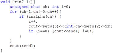Функция перебирает все коды от 1 до 255 (символа с кодом ноль не существует), и для каждого кода вызывает isalpha. Обратите внимание на условие в заголовке цикла. Если написать заголовок for (ch=1; ch< =255; ch++){…}, то программа зациклится, так как после сложения 255 с единицей значение ch будет равно нулю, а для нуля условие выполняется. Чтобы вывести на экран код символа, мы преобразовали ch к типу int. Чтобы вывести на экран символ, достаточно указать в инструкции вывода имя переменной типа char. Результат работы функции зависит от того, выполняли ли вы функцию setlocale. Если нет, то на экран будут выведены только латинские буквы и их коды. В противном случае кроме латинских будут выведены русские и другие буквы (кириллица), которые есть в кодировке CP1251 Windows. Некоторые из них на экране могут быть отображены некорректно.