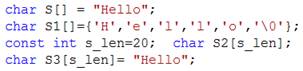 Строку можно разместить и в динамической памяти, но в этом случае ее нельзя инициализировать текстовой константой: