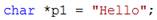 определяет указатель на текстовую константу, а не строку в динамической памяти, поэтому изменять такую строку нельзя (во время выполнения оператора p1[0] = 'h' возникнет ошибка). Можно создать массивы строк: