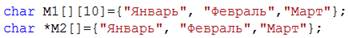 Для доступа к отдельной строке используются квадратные скобки: M1[i] или M2[i]. Так, например, можно вывести на экран значения массива строк: