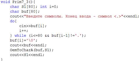 Пример 3 Ввод-вывод символов. Для ввода символов воспользуемся операцией > >. В этом случае пробельные символы (пробел, табуляция, перевод строки) игнорируются. Ввод выполняется посимвольно. Введенные символы помещаются в строку buf. Ввод заканчивается, если введен символ точка или введено 79 непробельных символов.