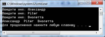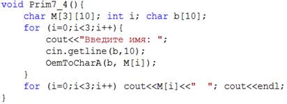 При вводе – выводе русских букв в консоли возникают проблемы, так как по умолчанию в окне консоли используется кодировка cp866, а в программе мы выводим текст в кодировке Windows-1251. Коды русских букв у этих кодировок разные, поэтому и происходит искажение. Одно из возможных решений – преобразование введенной строки в нужную кодировку с помощью функции OemToCharA (заголовочный файл < windows.h>). Чтобы ввести любые символы, включая пробельные, нужно воспользоваться методом get объекта cin. Вместо инструкции cin> > buf[i] используйте cin.get(buf[i]) или buf[i]=cin.get(). Пример 4 Ввод-вывод элементов массива строк. Напишем функцию, которая сначала заполняет массив имен из трех элементов, а затем выводит его на экран. Длина каждого имени – не более 9 символов. Для ввода строки используется метод getline объекта cin. Метод getline(S, n) считывает из входного потока n-1 символ или менее, если символ перевода строки встретится раньше. Символ перевода строки (\n) удаляется из входного потока, но не записывается в строковую переменную S. В S помещается завершающий нулевой символ.