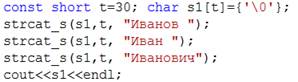 strcat_s(a, m, b) – копирует b в конец строки a, m – максимальное количество элементов массива a. Перед копированием в строке a обязательно должен быть нулевой символ. Пример использования функции: