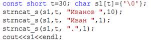 strncat_s(a, m, b, n) – копирует первые n символов b в конец строки a и вставляет нулевой символ, m – максимальное количество элементов массива a. Перед копированием в строке a обязательно должен быть нулевой символ. Функция возвращает указатель на строку a. Пример использования функции: