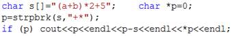 strpbrk(s, c) – ищет символы строки c в строке s. Возвращает указатель на первый найденный символ. Если символов в строке s нет, то возвращает NULL. Пример использования функции: