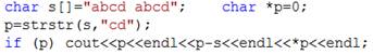 strspn(s, c) – возвращает номер первого символа строки s, который не совпадает ни с одним из символов строки c. strstr(s1, s2) – ищет в строке s1 строку s2. Возвращает указатель на первое вхождение s2 в s1 или NULL в противном случае. Пример использования функции: