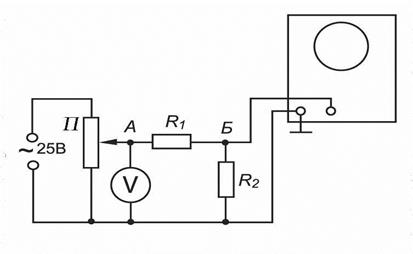 Задание 4. Измерение с помощью осциллографа неизвестного сопротивления, напряжений электрического тока и мощности. Собрать электрическую схему, изображенную на рис. 36.8. Напряжение“~25В“ подать на вторичную обмотку повышающего трансформатора с коэффициентом трансформации k= 3, 2. Напряжение с первичной обмотки подать на схему. Регуляторы лицевой панели осциллографа устанавливать следующим образом (см. рис. 36.4). Ручку плавной регулировки чувствительности усилителя вертикального отклонения 5 – в правом положении (точка напротив указателя). Сдвоенные регуляторы чувствительности 14: большая ручка для переключения диапазонов - на цифре 50, а малая - до упора вправо, Переключатель 17 – в положении “Ус.X. Рукоятку “ Множитель“ усилителя горизонтального отклонения луча 13 – в положении “Ус.X“. Регулировка длительности 9 – на цифре 1. Регулятор уровня напряжения сигнала запуска 25 – посередине на 0. Рукоятка “ Режим запуска“ 19 – большая ручка в начале стрелки “ Ждущий ” налево, малая ручка - напротив отметки “ Калибр. ”.