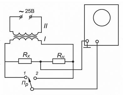 Рис. 36.8 Переключатель Пр поставить сначала в положение 2 и определить отклонение луча осциллографа, DН соответствующее падению напряжения на нормальном сопротивлении RН. Затем аналогично при положении переключателя Пр в положении 1 определить отклонение луча осциллографа DX, соответствующее падению напряжения на неизвестном сопротивлении RX. .