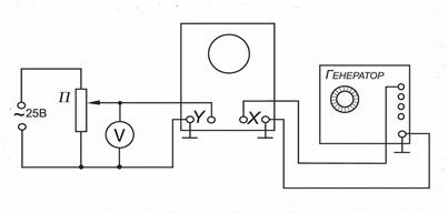 Рис. 36.7 Регуляторы лицевой панели осциллографа установить следующим образом (см. рис. 36.4). Ручку плавной регулировки чувствительности усилителя вертикального отклонения 5 – в максимально правом положении (точка напротив указателя). Сдвоенные регуляторы чувствительности 14: большая ручка для переключения диапазонов - в положении “ 1 “, а малая повернута вправо до отказа (узкая полоса). Переключатель 17 – в положении “Ус.X. Рукоятку “ Множитель“ усилителя горизонтального отклонения луча 13 – в положении “Ус.X“. Регулировка длительности 9 – на цифре 1. Регулятор уровня напряжения сигнала запуска 25 – посередине на 0. Рукоятка “ Режим запуска“ 19 – большая ручка в начале стрелки “ Ждущий ” налево, малая ручка - напротив отметки “ Калибр. ”. Затем включить вилку напряжения “~ 25 В“ и потенциометром П установить напряжение на вольтметре 15 В. После чего изменять напряжение, подаваемое на вход усилителя “Y“, изменением сопротивления R2 от 0 до 9 Ом через 1 Ом, и при каждом значении сопротивления R2 записать величину отклонения луча (в миллиметрах шкалы) на экране трубки. Напряжение, подаваемое на вход усилителя, вычислить по формуле