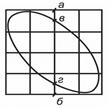 Движковый тумблер 26 делителя напряжений - в положении “ 1: 10 “, регулятор 25 – до упора направо. Подать напряжение на схему, потенциометром П установить напряжение на вольтметре порядка 4 В. Наблюдают эллипс на экране. Рис. 36.11 Регуляторами 5 и 25 необходимо вписать его в квадрат со стороной 40 мм.Определить отрезки вг и аб в делениях шкалы экрана (аб должно быть равно 40 мм). Сдвиг фазы между двумя напряжениями определить по формуле