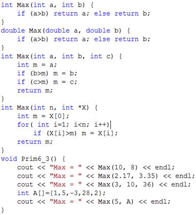 Если для аргумента функции задать значение по умолчанию, то при вызове этот аргумент можно опускать. Нужное значение указывается в заголовке функции после знака равно: void f(int arg1= 0, int arg2 = 1000); void f(int = 0, int = 1000); Аргументы по умолчанию должны быть константами или глобальными переменными. Значение по умолчанию указывается либо при объявлении функции, либо в заголовке ее определения, но не вместе. Все параметры по умолчанию должны находиться правее параметров, задаваемых явно. Пример вызова функции: f(), f(22), f(3, 9). Нельзя задать только второй аргумент, а для первого использовать значение по умолчанию. Перегрузка функций Функции, которые имеют одинаковое имя, но отличаются числом или типом своих аргументов называются перегруженными. Какую функцию нужно вызвать, компилятор определяет по типу фактических параметров. Пример 6.3. Использование перегруженных функций. В данном примере имеется четыре функции нахождения максимума: из двух целых чисел, двух вещественных чисел, трех целых чисел и среди элементов одномерного целочисленного массива.