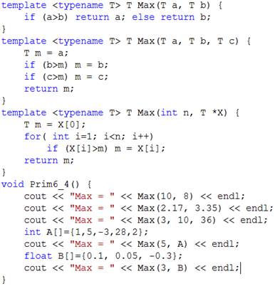 Шаблоны функций Шаблон (template) – средство программирования, которое позволяет создавать функции и классы, в которых тип задается в качестве параметра. В шаблоне функции определяется алгоритм, который может применяться к данным разных типов, а конкретный тип данных передается функции в виде параметра на этапе компиляции. Компилятор автоматически генерирует правильный код, соответствующий переданному типу. Таким образом мы получаем целый набор перегруженных функций на базе одного программного кода. В предыдущем примере две первые функции отличаются только типом, алгоритм у них абсолютно одинаковый, поэтому в этом случае удобно создать функцию-шаблон. В простейшем случае функция-шаблон определяется так: template < typename тип_данных> тип_функции имя_функции (параметры) { /* тело функции */} Тип_данных – это имя фиктивного типа. Компилятор автоматически заменит его именем реального типа данных при создании конкретной версии функции. Вместо слова typename может использоваться class. Параметры шаблона указываются в угловых скобках через запятую. Их может быть несколько. Параметр может быть не только типом, но и просто переменной: template < typename T1, typename T2, int i> void F() {…} Конкретный тип определяется компилятором при вызове функции автоматически по типу фактических параметров или указывается явно в угловых скобках после имени функции. На месте параметра шаблона, не являющегося типом, указывается константное выражение: F< int, double, 10> (); Шаблоны функций можно перегружать как с помощью шаблонов, так и обычными функциями. Пример 6.4. Использование шаблонов функций. В данном примере создаются шаблоны функции вычисления максимума из двух и трех переменных одного типа и среди элементов одномерного массива, а также показывается вызов этих функций.
