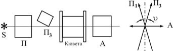 В работе используется полутеневой поляриметр Липпиха (рис.6). Источником света S служит ртутная лампа с линейчатым спектром. Для выделения монохроматического света используется набор светофильтров F. Параллельный пучок от источника проходит через поляризатор, образец и анализатор. Между поляризатором и исследуемым образцом располагается третья поляризационная призма. Она называется полутеневой призмой Липпиха и перекрывает только половину площади сечения поляризатора. Плоскости колебаний вектора Е, пропускаемые поляризатором П1 и малой призмой П3, располагаются под небольшим углом u. Ребро малой призмы (рис.6) составляет угол около 10 с оптической осью прибора. Расположение плоскостей колебаний вектора Е представлено на рис.7. П1 - направление колебаний вектора Е после поляризатора, П2 - направление колебаний на выходе из призмы Липпиха, А – направление разрешенных анализатором световых колебаний. Если направление разрешенных анализатором световых колебаний (на рис.7. обозначено буквой А) перпендикулярно биссектрисе угла u, то обе половины круга, расположенного в поле зрения (видимого в окуляр), освещены одинаково. Именно этому положению анализатора соответствует нулевая точка прибора. При этом следует обратить внимание на то, что при малых поворотах анализатора в разные стороны от этого положения более темной становится то левая, то правая половина поля зрения. При значительных отклонениях анализатора от нулевого положения (более 100) обе половины поля зрения становятся яркими и субъективно кажутся равноосвещенными и не изменяющимися при дальнейшем вращении анализатора. В этом случае следует найти такое положение анализатора, при котором обе половины поля зрения освещены одинаково, причем при малом повороте анализатора по часовой стрелке одна половина поля зрения становится темной, а против часовой стрелки - другая. Такое положение равной освещенности и является искомым. При внесении в поляриметр кюветы с исследуемым оптически активным веществом плоскости поляризации П1 и П3 повернутся на один и тот же угол. Этот угол можно определить поворотом анализатора на тот же угол, чему экспериментально будет соответствовать одинаково освещенные половины поля зрения. Отсчет поворота анализатора осуществляется с помощью лимба и нониуса. В настоящей работе используется модификация поляриметра Липпиха не с одной, а с двумя малыми призмами П3, расположенными по разные стороны от оптической оси, между которыми имеется небольшой зазор. Это приводит к тому, что поле зрения разбивается не на два, а на три участка. В случае трехпольного поляриметра анализатор должен устанавливаться в положение, при котором три участка поля зрения имеют одинаковую освещенность.