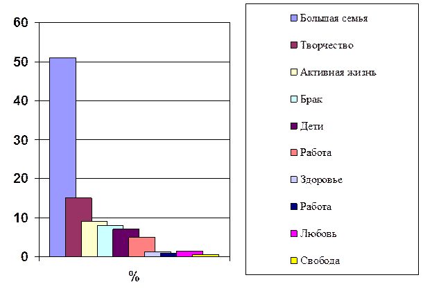 Для проведения исследования была проведена выборка из студентов ВолгГму. Она составила 70 человек. При опросе не отбирались определенные специальности, так как предполагается, что будущая квалификация не оказывает влияния на семейные ценности, поэтому опрашивали студенческие группы 3, 5 и 6 курсов. Для проведения исследования была составлена анкета из 23 вопросов. Последовательность вопросов была составлена с учетом классификации семейных ценностей: сначала в анкете идут вопросы, связанные с супружеством, далее с родительством и с родством. В результате исследования определилось, какие именно семейные ценности являются приоритетными для студенческой молодежи, и были получены следующие результаты: Большинство респондентов (83 %) не состоят в браке, 14 % состоят в незарегистрированном (гражданском браке), и только 3 % опрошенных состоят в официальном браке. Однако 71 % студентов женского пола определенно собираются вступать в официальный брак, среди мужской части опрошенных 54 % также собираются вступать в зарегистрированный брак. Скорее всего вступать в брак собираются 27 % опрошенных среди девушек и 24 % среди юношей, в то время как, 5 % среди девушек и 12 % среди юношей затрудняются ответить. Скорее всего не собираются заключать брак 4 % юношей, а среди опрошенных девушек такого варианта ответа не наблюдалось. Определенно не собираются вступать в брак 6 % юношей и 2 % девушек. Отношение к неофициально (гражданскому) браку среди девушек в основном характеризуется следующими данными: 44 % относятся отрицательно, а 45 % положительно, 11 % нейтрально. Среди мужской части опрошенных выяснилось, что 61 % относится нейтрально, 19 % отрицательно и 20 % положительно. Мнения о возрастной границе вступления в брак, как у юношей, так и девушек оказались примерно одинаковыми, а именно, оптимальным возрастом у мужчин является 26-30 лет, так ответили 73 % девушек и 82 % юношей, для женщин оптимальным возрастом посчитали возраст 21-25 лет 73 % девушек и 87 % юношей. Для 12 % девушек и 10 % юношей возраст заключения брака значения не имеет. Лишь 5 % девушек и 8 % юношей считают, что возраст заключения брака как у мужчин, так и женщин должен быть свыше 30 лет. Изучив шкалу ценностей респондентов, получили очень интересные результаты. Большая часть респондентов (51 %) отметила, что наибольшую ценность представляет большая семья со значительным количеством родственников. Второй ценностью оказалось творчество (15 %). На третьем месте стоит ценность активной жизни (9 %), четвертое месть занял брак (8 %), на следующей позиции стоит ценность детей (7 %), шестое место занимают работа и друзья (5 и 5 %), остальные ценности, такие как здоровье, любовь, интересная работа, свобода, материальное обеспечение набрали по 1 %. Рисунок 1 – Шкала ценностей респондентов Причинной заключения брака среди девушек 35 % выбрали любовь, 35 % выбрали желание создать семью, 29 % рождение ребенка, 1 % расчет. Независимость от родителей ни у одного из опрошенных не явилось причиной заключения брака. Среди юношей 45 % считают причиной желание создать семью, 20 % отметили, что главной причиной является рождение ребенка, 10 % - любовь, 3 % - независимость от родителей и 2 %- расчет. При анализе вопроса о том, что в вашем представлении является семьей, 66 % опрошенных дали определение, остальные 34 % затруднились в определении данного понятия. Из полученн
