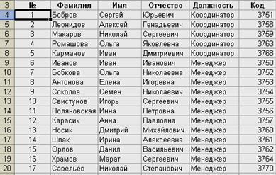 В результате такой сортировки на первые позиции встали все «Координаторы», причем между собой они отсортированы по «Коду». В конце у нас «Менеджеры», которые тоже отсортированы между собой по «Коду». 4. Фильтрация базы данных предусмотрена для того, чтобы быстро извлекать из документа записи, которые соответствуют указанным критериям, а затем переносить эту информацию в другие части листа или применять в отчетах. Для извлечения информации из базы данных по заданному критерию установите курсор в любую ячейку базы данных и выполните: