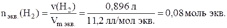 Зная молярный объем эквивалентов водорода, найдем количество вещества эквивалентов водорода, содержащихся при н.у. в 0, 883 л этого газа: