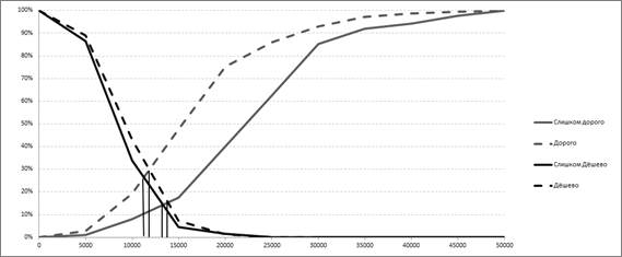 Рисунок 5. Price Sensitivity Meter для годового абонемента Как показывает график, построенный по метоу Ван-Вестендорпа, при назначении таким клубом, как Формула Энергии цены на годовое посещение меньше одиннадцати тысяч рублей или больше 14 тысяч рублей