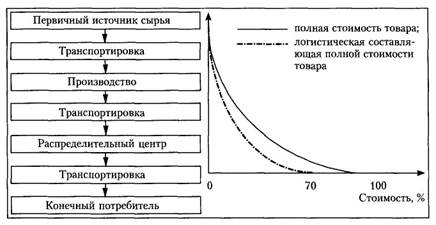 Рис. 1.2. Структура стоимости готовой продукции на пути от источников ресурсов до конечного потребителя ■ обеспечение конкурентных преимуществ за счет снижения себестоимости готовой продукции и улучшения качества поставок; ■ мировой энергетический кризис; ■ научно-технический прогресс, и в первую очередь компьютеризация управления, позволившая создавать модели логистических систем и процессов; ■ превращение рынка продавца в рынок покупателя. Выделяют три этапа развития логистических принципов управления производством. Первый этап — 60-е годы XX в. — характеризуется объединением складского хозяйства с транспортом и координацией их совместного использования. На этом этапе транспорт и склад, прежде связанные лишь операцией погрузки или разгрузки, приобретают взаимные связи. Они начинают «работать» на один экономический результат по единой согласованной технологии. Тара, в которой отгружается груз, выбирается с учетом применяемого транспорта; в свою очередь, характеристики перевозимого груза определяют выбор транспорта. Второй этап — середина 80-х годов. К взаимодействию складирования и транспортировки начинает подключаться планирование производства. Это позволило повысить качество обслуживания покупателей за счет своевременности выполнения заказов, улучшить использование оборудования. Третий этап осуществляется в настоящее время. Совокупность материалопроводящих звеньев приобретает целостный характер (рис. 1.3). История развития российской логистики существенно отличается от западной. В условиях государственного планирования хозяйственной деятельности начиная с 30-х годов XX в. в России ставились задачи оптимизации мощных грузовых потоков. Для их решения зачастую создавался уникальный методический аппарат.
