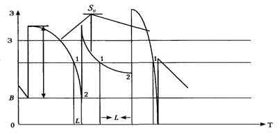 Рис. 5.3. Типичное изменение уровня запасов в системе с фиксированным размером заказа: З — наличные запасы, ед.; Т — время; Sv — переменная интенсивность сбыта; В — резервный запас; 3* — средний уровень запасов; 1 — момент подачи заказа; 2 — момент получения заказа; L — время доставки заказа, сутки
