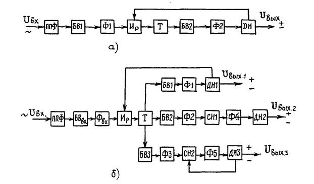 Рисунок 1.9 - Типовые структурные схемы регулирующих ИВЭ-выпрямителей с бестрансформаторным входом: а - одноканального; б – многоканального стабилизирующего