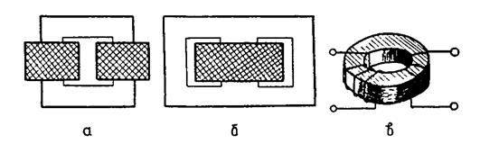 Рисунок 7.4 - Основные виды однофазных трансформаторов а - стержневой; б - броневой; в - тороидальный