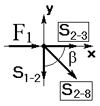 | Известными являются: внешняя сила F1 =10 кН и усилие в стержне S1-2 = =S2-1 = –15, 8 кН. Неизвестными являются усилия в перерезанных стержнях: S2-3 и S2-8.