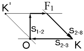 Определение неизвестных усилий произведём графическим способом. Для построения многоугольника сил примем масштаб: в 1 см 5 кН. Выберем произвольную точку О и отложим в масштабе от неё два вектора известных сил: S1-2 и F1, параллельно линиям действия этих сил и с учётом знаков. Вектор S1-2 (≈ 3, 1 см длиной) откладываем от точки О вверх и в конце этого вектора пристраиваем вектор F1 (2 см вправо). Затем из точки О и из конца вектора F1 проводим линии параллельно линиям действия S2-3 и S2-8 до их пересечений. Получилось две точки пересечений К и К’, которые равнозначны для образования замкнутого многоугольника сил. Примем для образования замкнутого многоугольника точку К. Тогда вектор S2-8 должен «войти» стрелкой в точку К, а вектор S2-3 «войти» стрелкой в точку О, чтобы получился замкнутый многоугольник сил с одинаковой ориентацией всех векторов (в данном случае – по часовой стрелке). Из направлений действия векторов видно, что S2-8 имеет положительное значение, а S2-3 – отрицательное